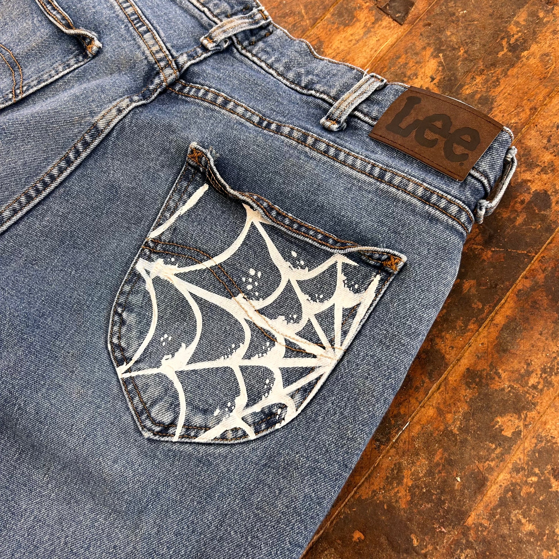 Light-wash Lees. Screen printed cross on thigh and web back pocket.