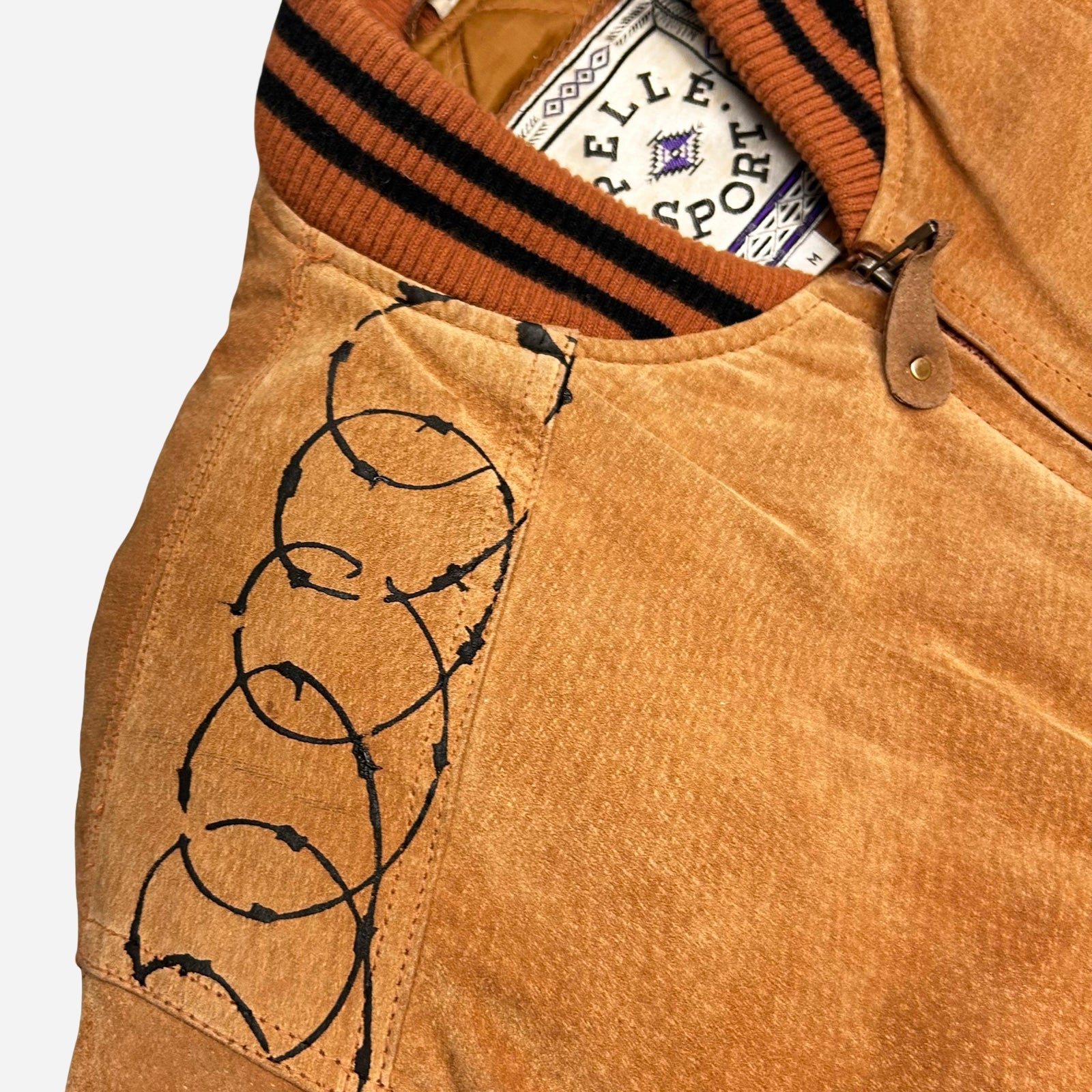 Tan suede bomber jacket. Pelle Sport. Custom screen printed doberman on chest and barbed wire on shoulder. Super clean inside, quilted gold lining, perfect fit for M–L.